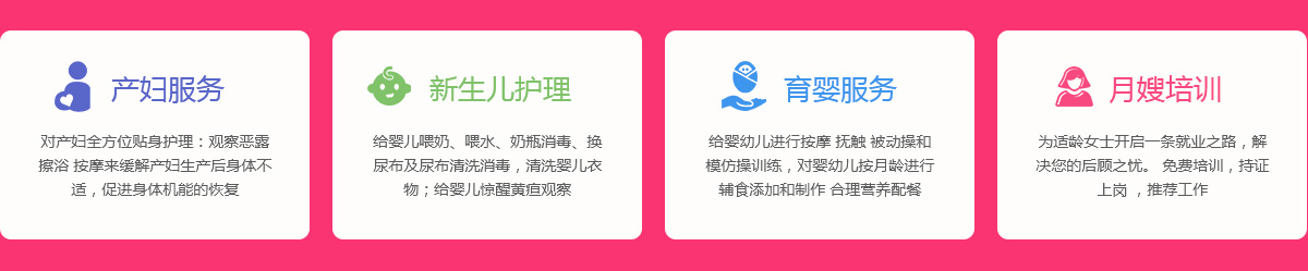關于我們 產婦服務 新生兒護理 育嬰服務 月嫂培訓 催乳師培訓 舒心家政 月子餐 資質榮譽 服務案例